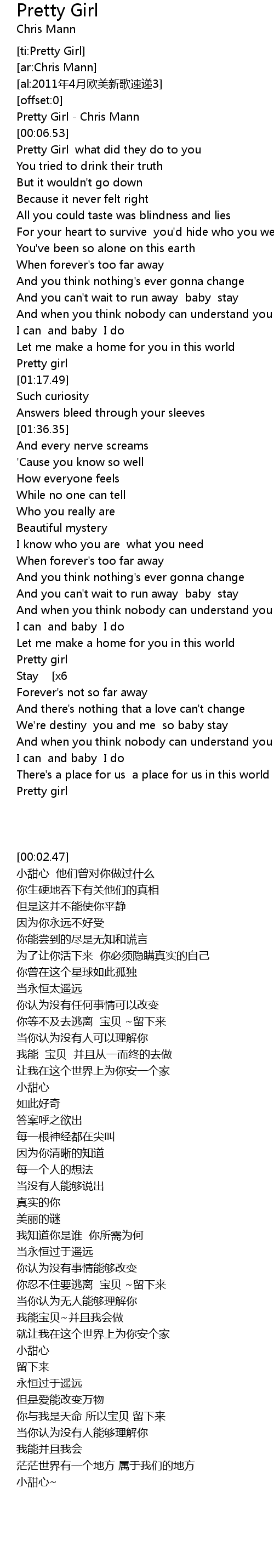 | [00:02.47] | Pretty Girl - Chris Mann |