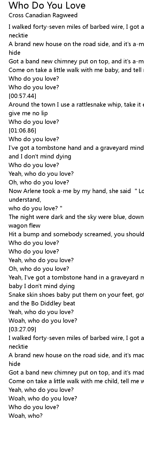 | [00:45.40] | Come on take a little walk with me baby, and tell me who do you love? |