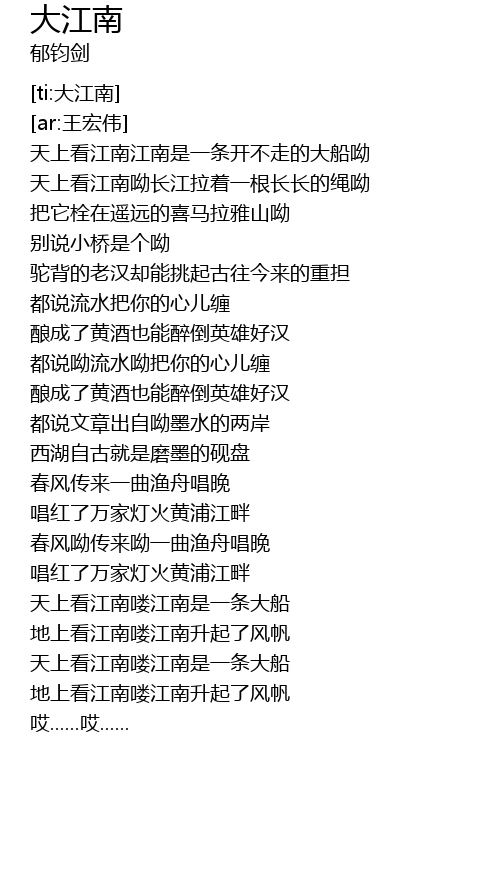 | [03:36.399] | 天上看江南喽江南是一条大船 |
