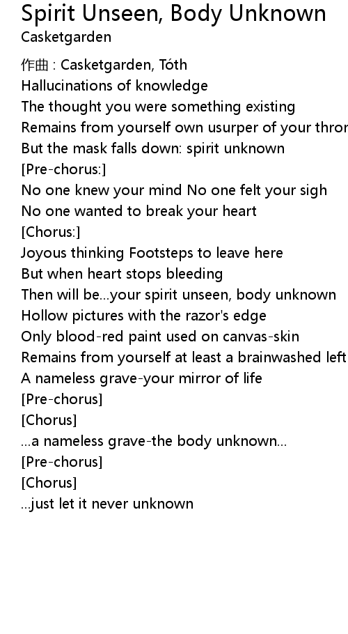 | Song | Spirit Unseen, Body Unknown |