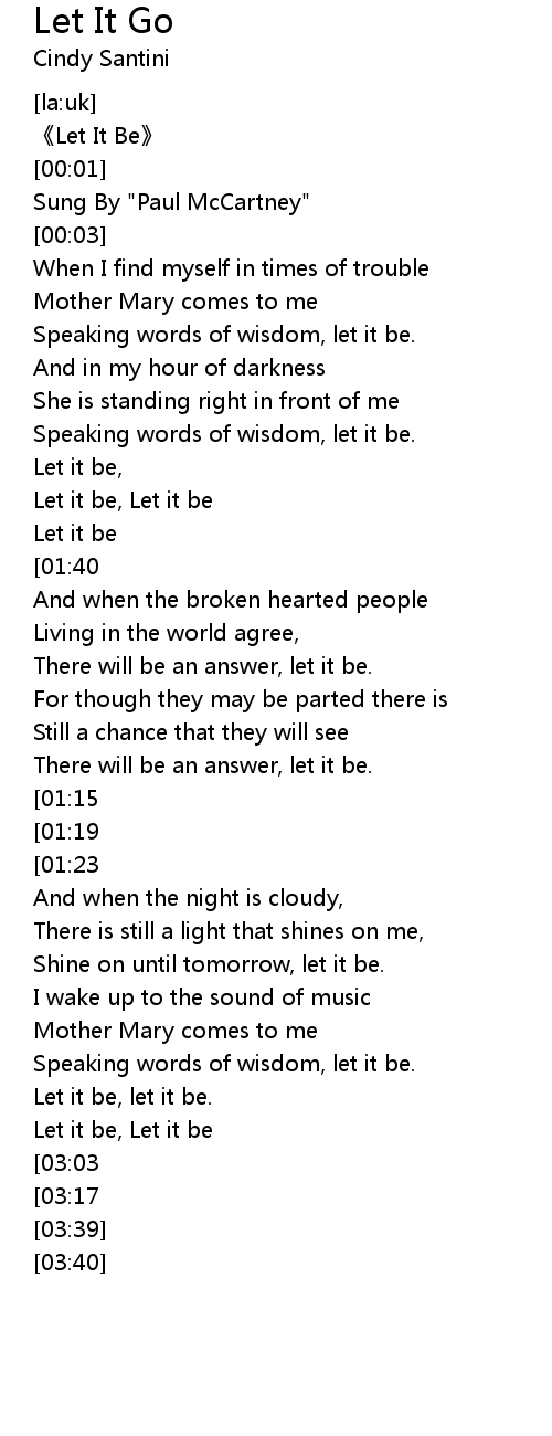 | [02:26][01:40][00:40] | Whisper words of wisdom, let it be. |