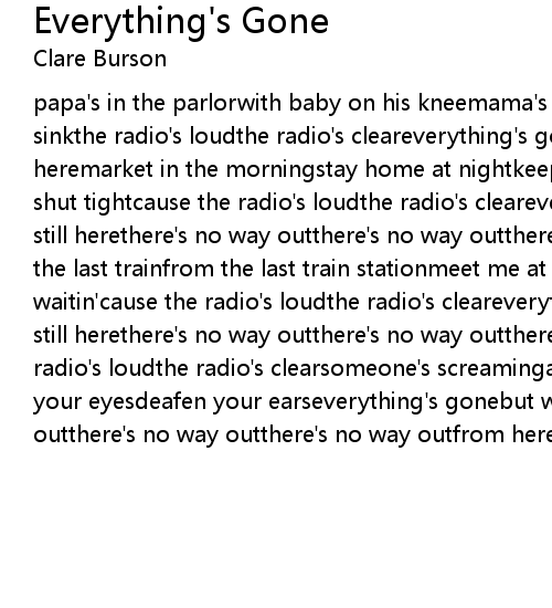 papa's in the parlorwith baby on his kneemama's in the kitchenwith dishes in the sinkthe radio's loudthe radio's cleareverything's gonebut we're all still heremarket in the morningstay home at nightkeep your head downkeep your mouth shut tightcause the radio's loudthe radio's cleareverything's gonebut we're all still herethere's no way outthere's no way outthere's no way outfrom heretake the last trainfrom the last train stationmeet me at the harborwhere i'll be waitin'cause the radio's loudthe radio's cleareverything's gonebut we're all still herethere's no way outthere's no way outthere's no way outfrom hereand the radio's loudthe radio's clearsomeone's screamingall the world can hearso blind your eyesdeafen your earseverything's gonebut we're all still herethere's no way outthere's no way outthere's no way outfrom here |