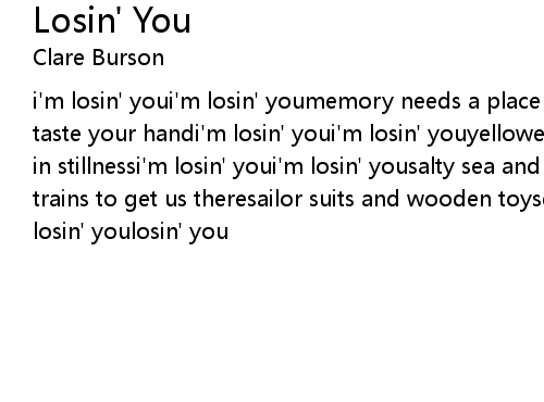 | i'm losin' youi'm losin' youmemory needs a place to landi held my tongue to taste your handi'm losin' youi'm losin' youyellowed page and faded penphotos lie in stillnessi'm losin' youi'm losin' yousalty sea and mountain airboats and trains to get us theresailor suits and wooden toysdaddy's girl and mama's boyi'm losin' youlosin' you |