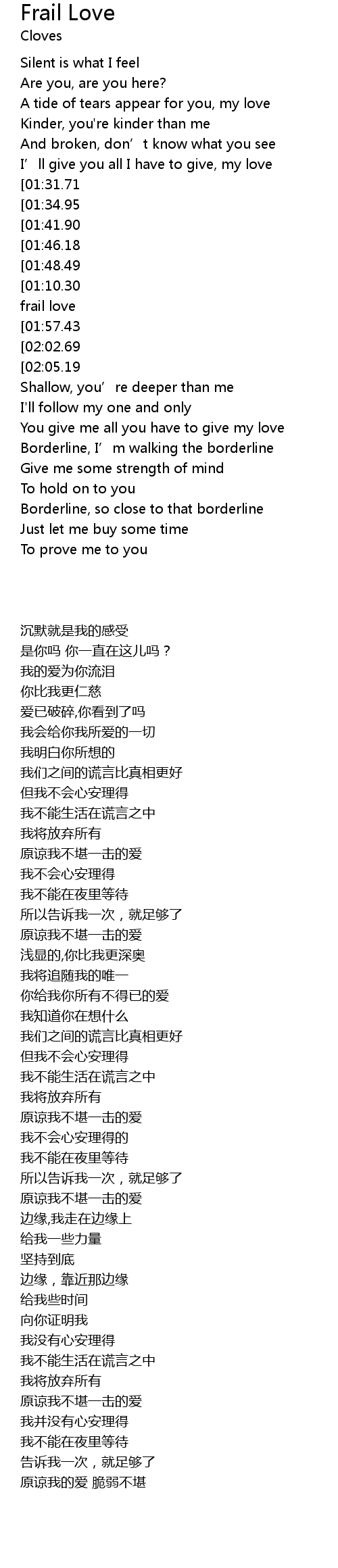 | [00:54.47][01:10.30][01:53.31][02:09.34][02:57.83][03:14.56] | Forgive me for my frail love |