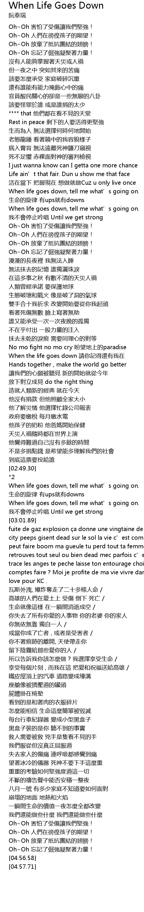 | [01:18.64] | When life goes down, tell me what’s going on. |
