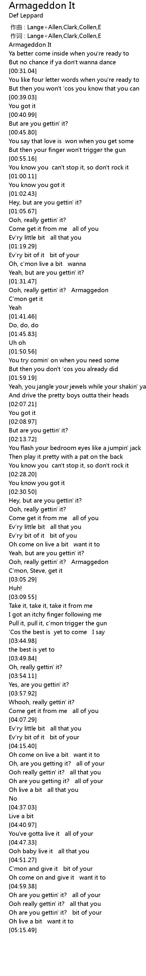 | [00:00.00] | 作曲 : Lange+Allen,Clark,Collen,E |