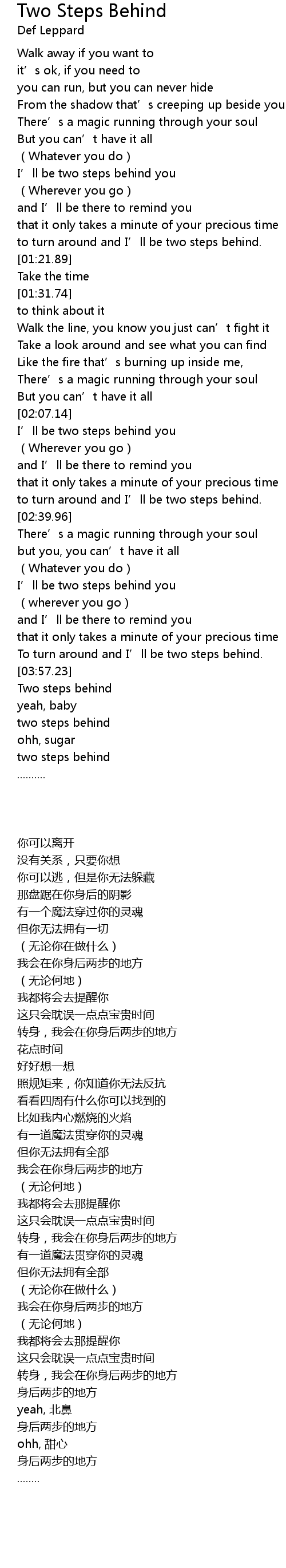 | [04:03.22] | two steps behind |