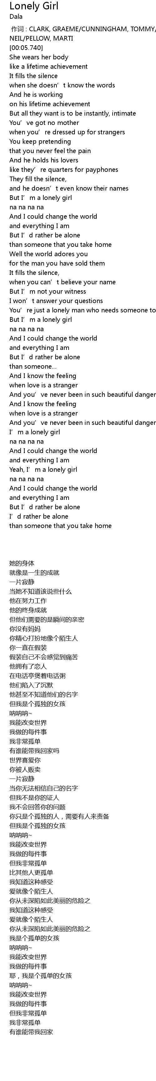 | [03:32.550] | Yeah, I' m a lonely girl |