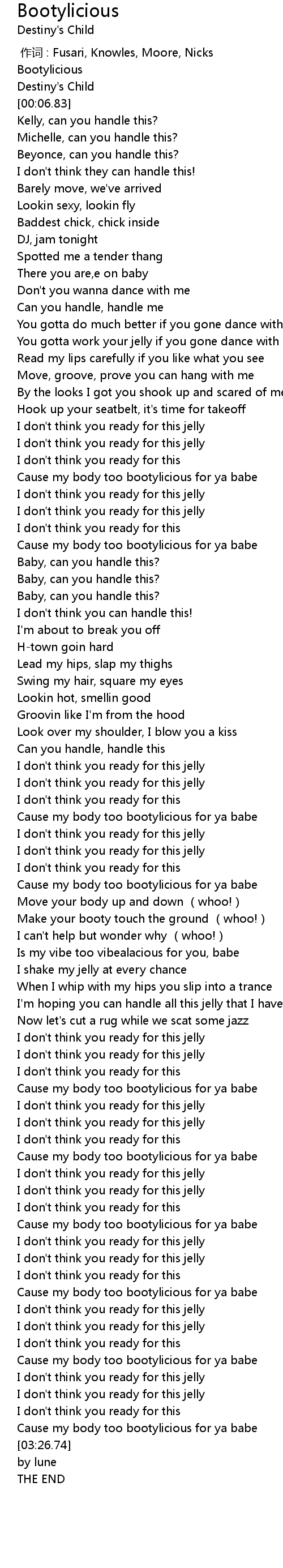 | [02:34.94] | Cause my body too bootylicious for ya babe |