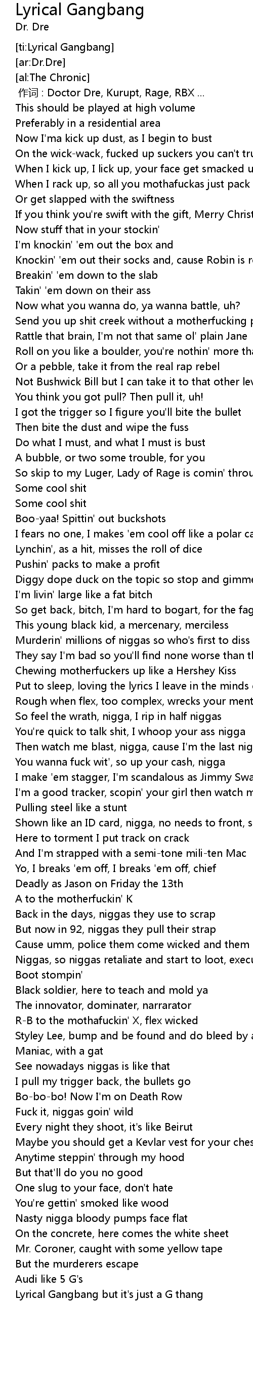| [00:00.00] | 作词 : Doctor Dre, Kurupt, Rage, RBX ... |