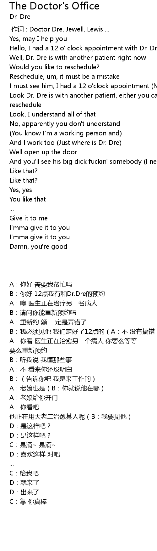 | [00:09.95] | Well, Dr. Dre is with another patient right now |