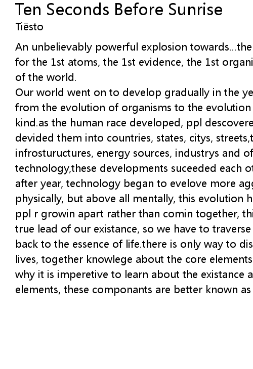 Our world went on to develop gradually in the years that followed, it progressed from the evolution of organisms to the evolution of life and indeed human kind.as the human race developed, ppl descovered the world, the contenents, devided them into countries, states, citys, streets,they created infrostuructures, energy sources, industrys and of course a wide range of technology,these developments suceeded each other at an even faster pace year after year, technology began to evelove more aggresively than ppl could handle physically, but above all mentally, this evolution has created a world inwhich ppl r growin apart rather than comin together, this path does not lead us to the true lead of our existance, so we have to traverse the force and make our way back to the essence of life.there is only way to discover the essence of our lives, together knowlege about the core elements that make life possible, thats why it is imperetive to learn about the existance and the funtion of the elements, these componants are better known as the elements of life. |