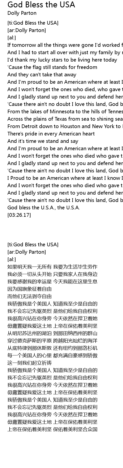 'Cause there ain't no doubt I love this land, God bless the U.S.A. |