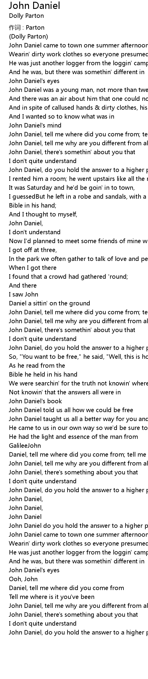 | John Daniel, tell me where did you come from tell me where is it you' ve been | |