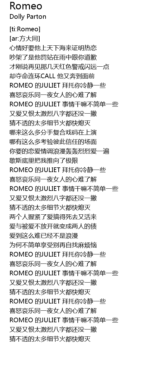 | [00:44.379] | ROMEO 的JULIET 事情干嘛不简单一些 |