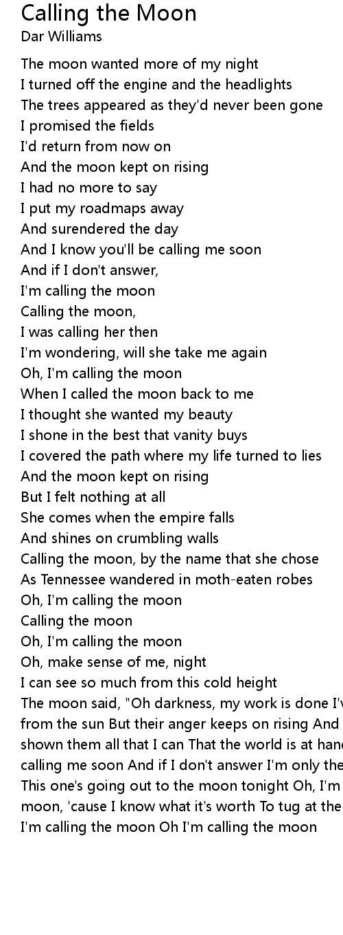 The moon said, "Oh darkness, my work is done I've poured this bottle of light from the sun But their anger keeps on rising And they don't understand I've shown them all that I can That the world is at hand And I know they'll be calling me soon And if I don't answer I'm only the moon I can see by her light This one's going out to the moon tonight Oh, I'm calling the moon Calling the moon, 'cause I know what it's worth To tug at the seas and illumine the earth Oh I'm calling the moon Oh I'm calling the moon |