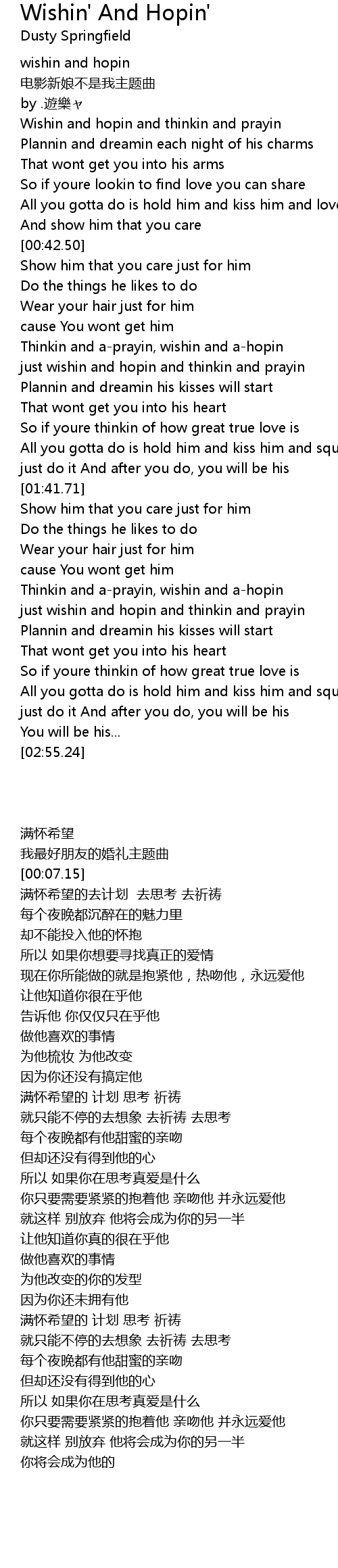 | [01:59.97] | Thinkin and aprayin, wishin and ahopin |