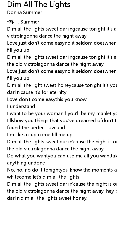 | Dim all the lights sweet darlin'cause the night is on the way, hey babyturn up the old victrolagonna dance the night away, hey babydim all the lights sweet darlin'dim all the lights sweet honey... |