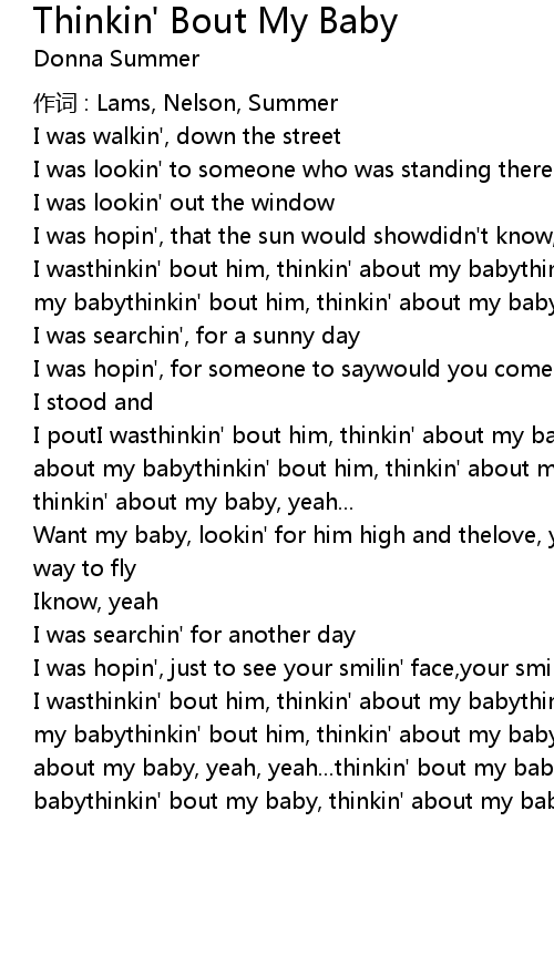 | I wasthinkin' bout him, thinkin' about my babythinkin' bout him, thinkin' about my babythinkin' bout him, thinkin' about my babythinkin' bout him, thinkin' about my baby, yeah, yeah... thinkin' bout my baby, thinkin' about my babythinkin' bout my baby, thinkin' about my baby... |