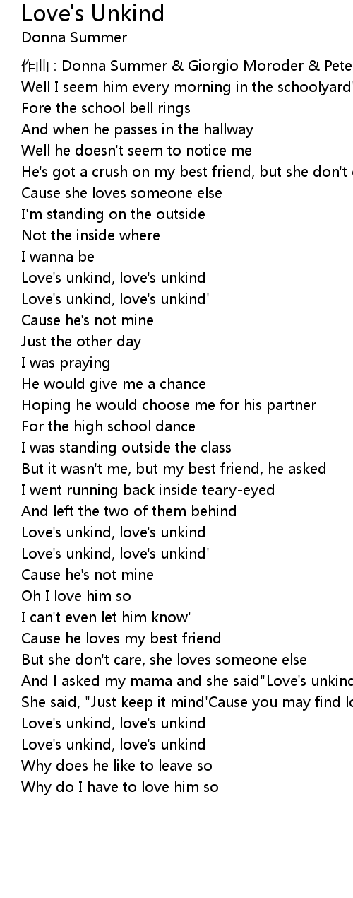 | And I asked my mama and she said" Love' s unkind, love' s so unkind" | |