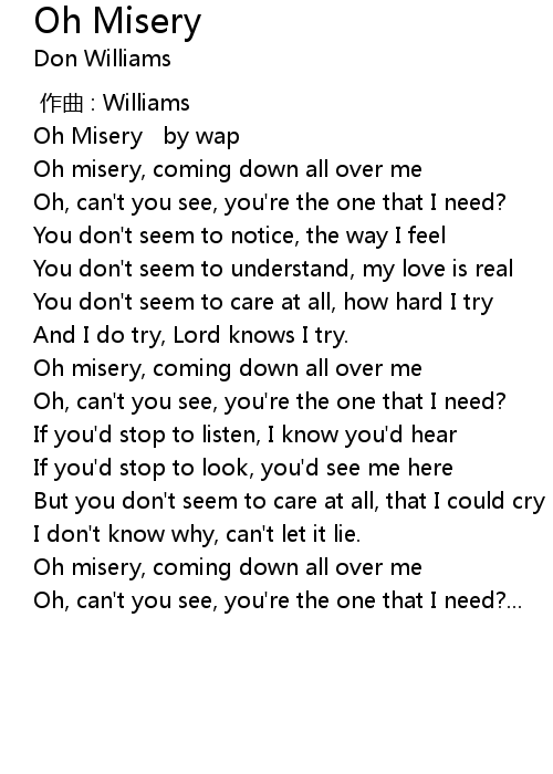 | [00:09.11] | Oh misery, coming down all over me |