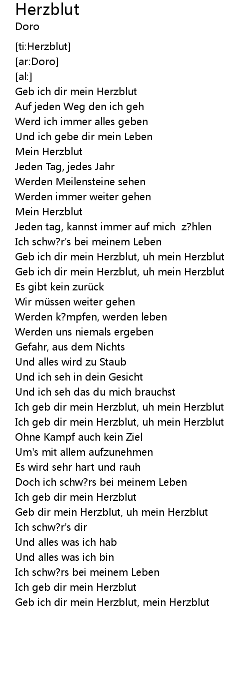 | [02:59.67] | Geb dir mein Herzblut, uh mein Herzblut |