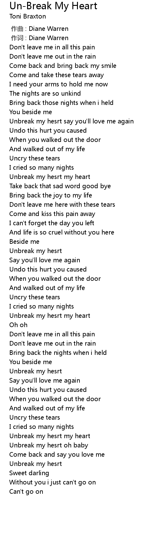 | [03:43.37] | Unbreak my hesrt oh baby |