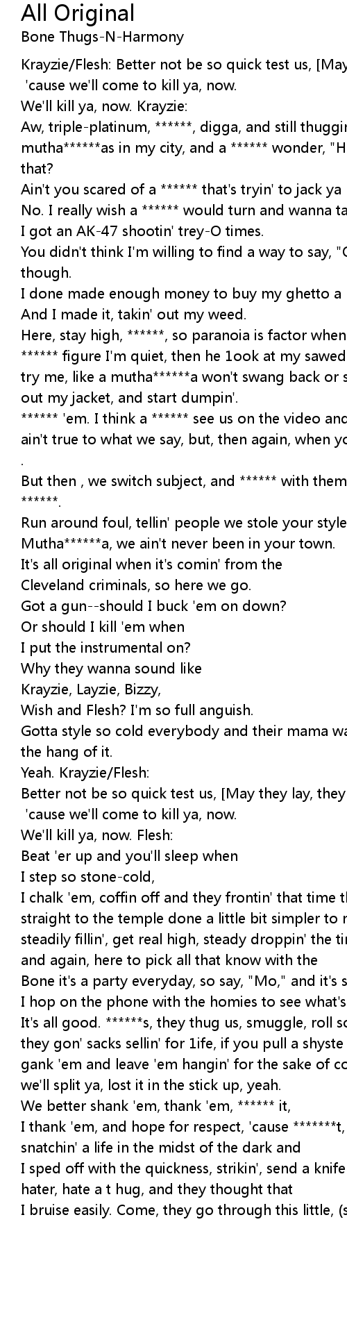 Krayzie/Flesh: Better not be so quick test us, [May they lay, they lay, may they lay, may they lay, may they lay.] 'cause we'll come to kill ya, now. |