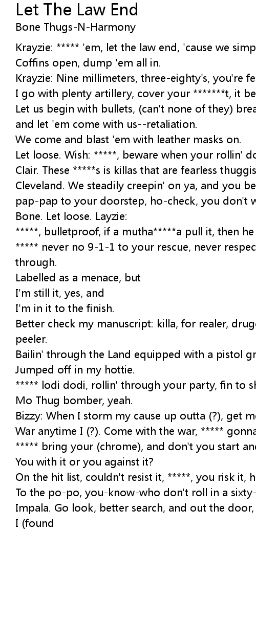Krayzie: ***** 'em, let the law end, 'cause we simply get the raw end. |