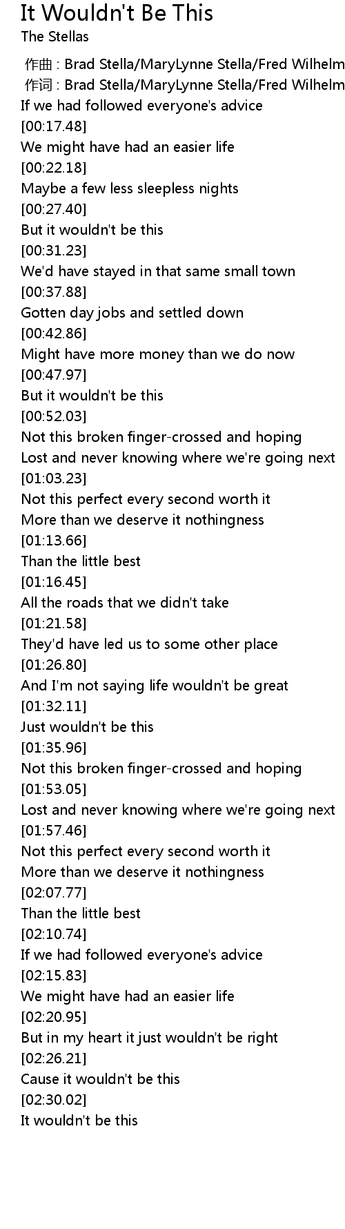 | [00:01.000] | zuò cí : Brad Stella MaryLynne Stella Fred Wilhelm |
