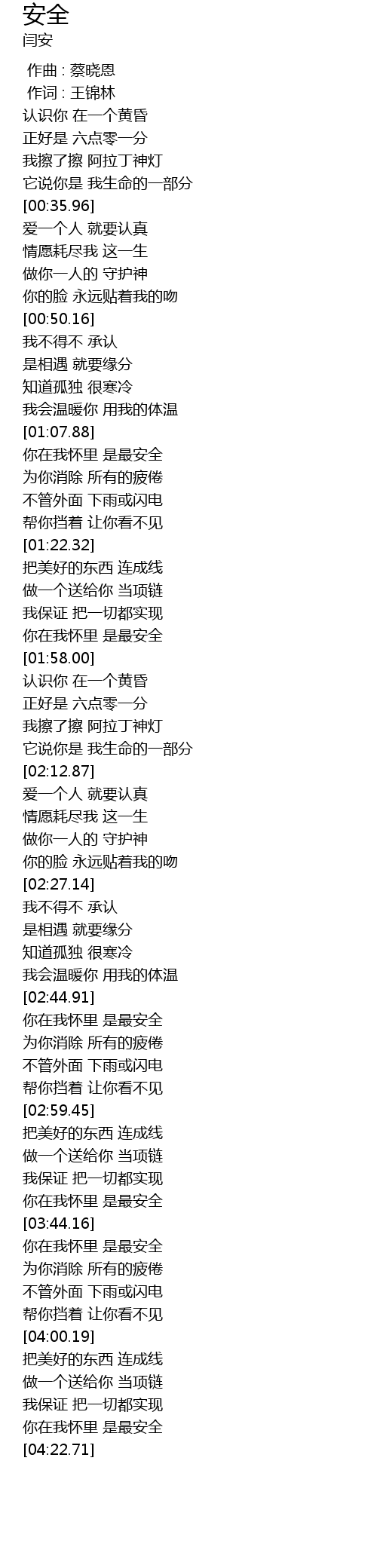| [03:46.10] | nǐ zài wǒ huái lǐ shì zuì ān quán |