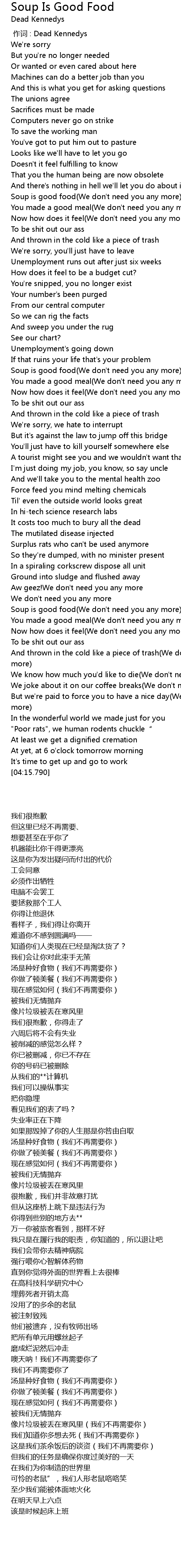 | [02:02.350] | Soup is good food(We don't need you any more) |