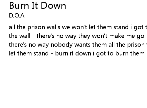 | all the prison walls we won't let them stand i got to burn them down. up against the wall - there's no way they won't make me go there's no way no one judges me there's no way nobody wants them all the prison walls - burn it down. we won't let them stand - burn it down i got to burn them down - burn it down |