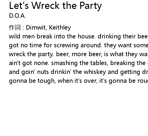 | wild men break into the house. drinking their beer and shouting abuse. they' ve got no time for screwing around. they want some action, so they shout. let' s wreck the party. beer, more beer, is what they want. get out of the way, ya ain' t got none. smashing the tables, breaking the chairs, oh my god! goin' crazy and goin' nuts drinkin' the whiskey and getting drunk. when it' s over, it' s gonna be tough, when it' s over, it' s gonna be rough. let' s wreck the party. |