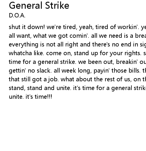 shut it down! we're tired, yeah, tired of workin'. yeah, workin' for nothin'. we all want, what we got comin'. all we need is a break, come on take a break. everything is not all right and there's no end in sight. you can call it, whatcha like. come on, stand up for your rights. stand up, stand and unite. it's time for a general strike. we been out, breakin' our backs. been out workin' gettin' no slack. all week long, payin' those bills. that's just the people, that still got a job. what about the rest of us, on the soupline. stand up, stand, stand and unite. it's time for a general strike. stand up, stand and unite. it's time!!! |