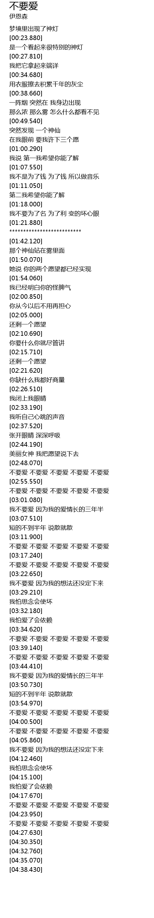 | [03:57.200] | bu yao ai bu yao ai bu yao ai bu yao ai bu yao ai |