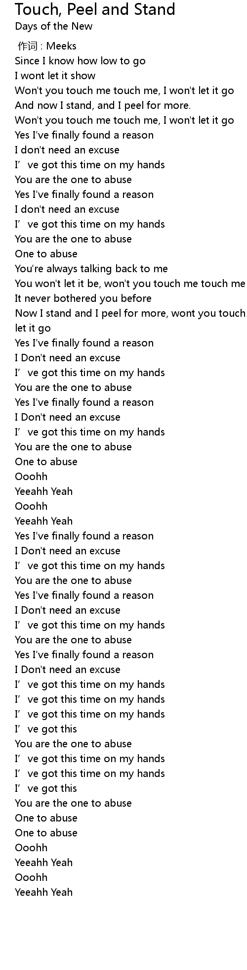 | [01:35.16] | Now I stand and I peel for more, wont you touch me touch me, i wont let it go |