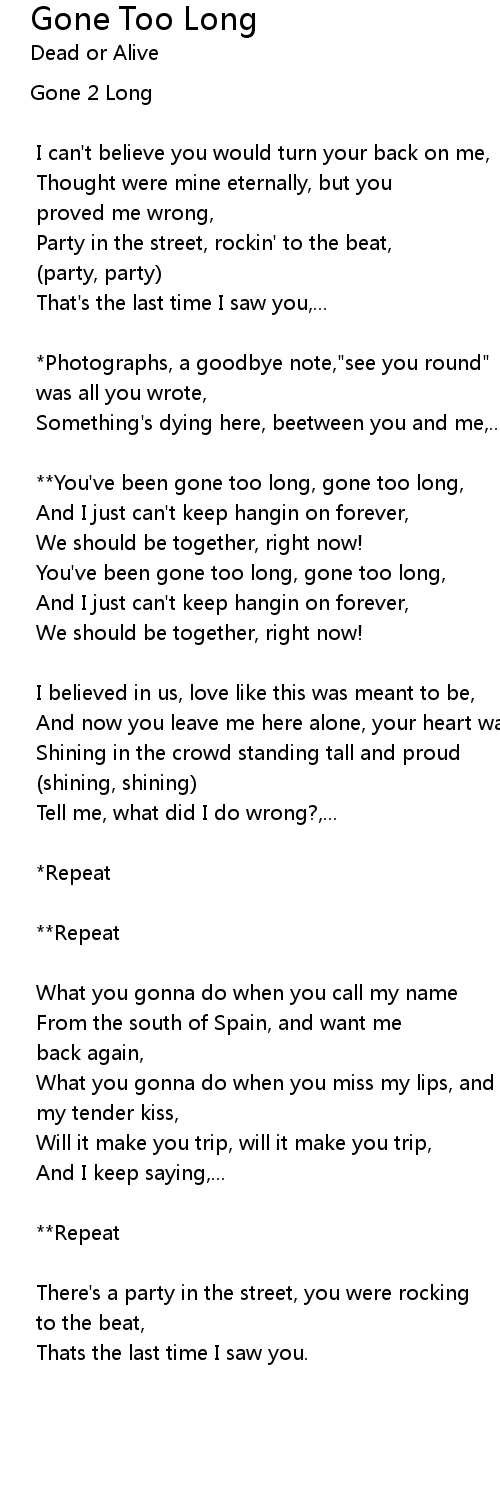 **You've been gone too long, gone too long, |