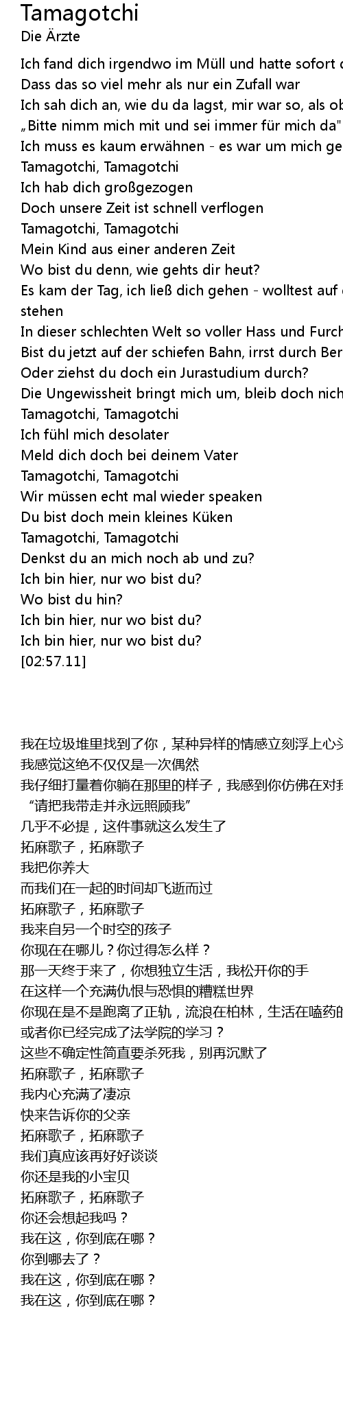 | [02:53.72] | Ich bin hier, nur wo bist du? |