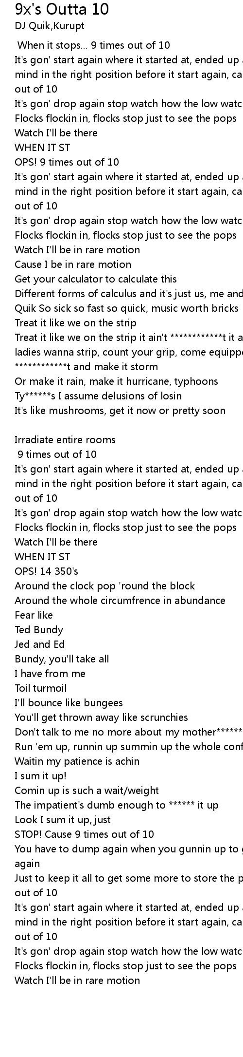 | [Kurupt] When it stops... 9 times out of 10 | |