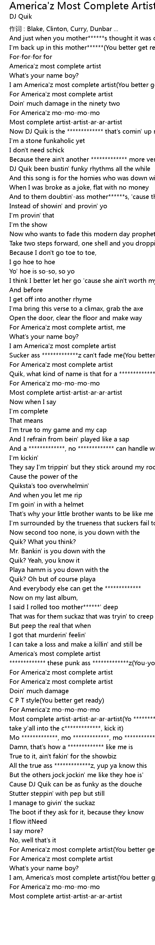 | Most complete artist-artist-ar-ar-artist(Yo ************* the bridge, I better take y'all into the c*************, kick it) | |