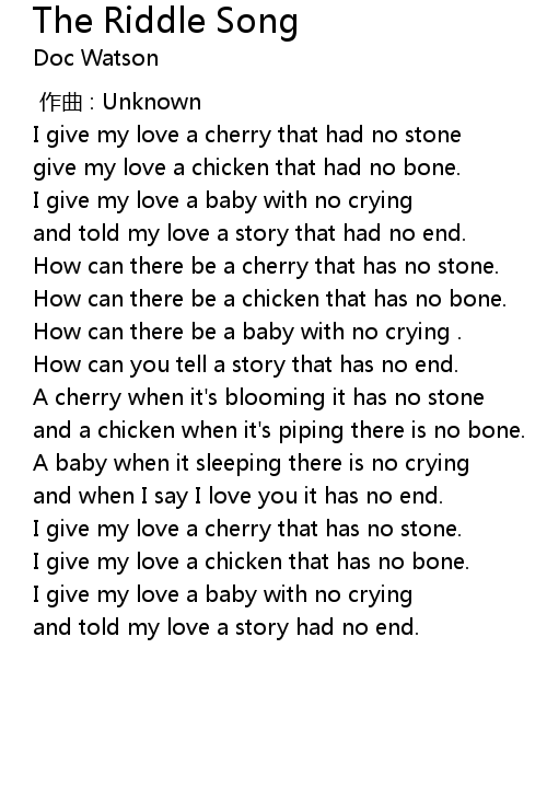 | [02:08.00] | I give my love a cherry that has no stone. |