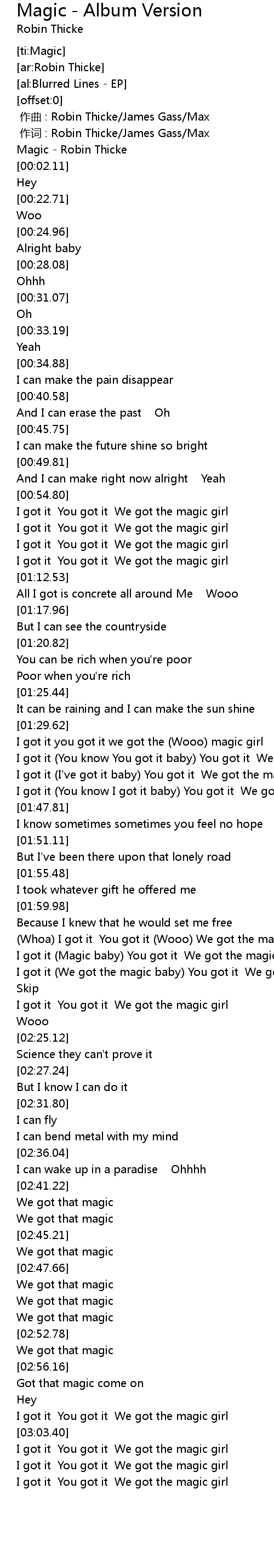 | [02:14.77] | I got it We got the magic baby You got it We got the magic girl |