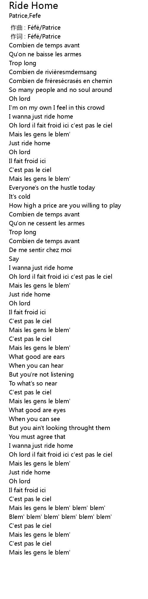 | [00:01.000] | 作词 : Féfé/Patrice |