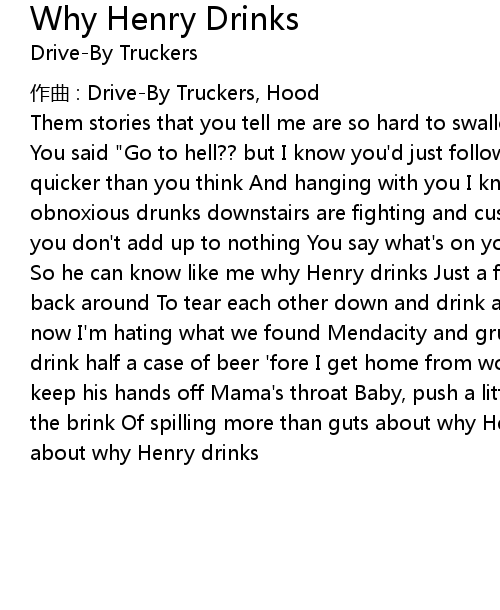 | You said " Go to hell?? but I know you' d just follow The future' s closing in quicker than you think And hanging with you I know why Henry drinks Those obnoxious drunks downstairs are fighting and cussing And twelve years of me and you don' t add up to nothing You say what' s on your mind tell it to your shrink So he can know like me why Henry drinks Just a few more hours till the sun comes back around To tear each other down and drink another round Lost it on the way now I' m hating what we found Mendacity and grudgefucks and pieces out of town I drink half a case of beer ' fore I get home from work Daddy needs his medicine to keep his hands off Mama' s throat Baby, push a little harder cuz you got me on the brink Of spilling more than guts about why Henry drinks Telling you so much about why Henry drinks |