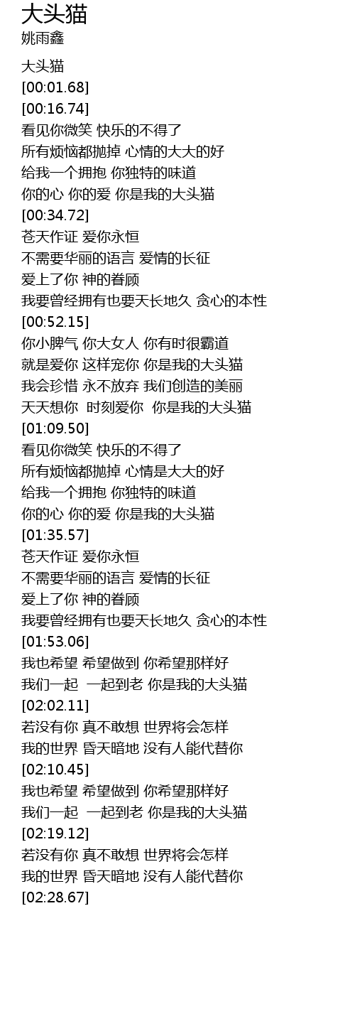 | [00:30.29] | 你的心 你的爱 你是我的大头猫 |
