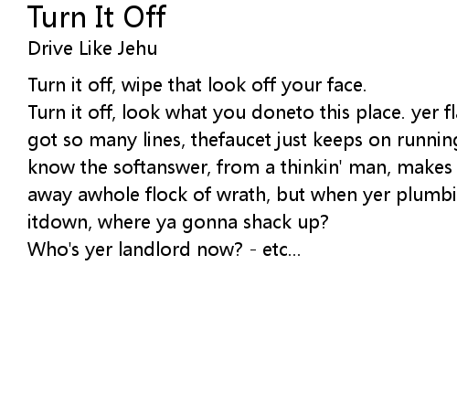 | Turn it off, look what you doneto this place. yer flawless sense of timing. you got so many lines, thefaucet just keeps on running, water down in style - ya know the softanswer, from a thinkin' man, makes for the softest landing, turn away awhole flock of wrath, but when yer plumbing backs up, you're gonna drink itdown, where ya gonna shack up? | |