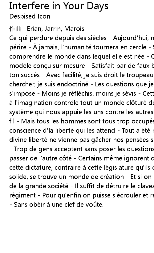 | Ce qui perdure depuis des siè cles Aujourd' hui, n' est pas sur le point de pé rire À jamais, l' humanité tournera en cercle Sans chercher à comprendre le monde dans lequel elle est né e Chaque tre na t en suivant un modè le con u sur mesure Satisfait par de faux besoins L' acceptation fait ton succè s Avec facilité, je suis droit le troupeau Pas besoin de chercher, je suis endoctriné Les questions que je pose, c' est le mal qui s' impose Moins je ré flé chis, moins je sé vis Cette vo te qui fait ombrage à l' imagination contr le tout un monde cl turé de sanctions Ce merveilleux systè me qui nous appuie les uns contre les autres tient, en fait, que par un fil Mais tous les hommes sont tous trop occupé s par l' argent pour prendre conscience d' la liberté qui les attend Tout a é té manigancé pour que cette divine liberté ne vienne pas g cher nos pensé es sans m me pouvoir l' imaginer Trop de gens acceptent sans poser les questions qui leur permettraient de passer de l' autre c té Certains m me ignorent qu' en dehors, au delà de cette dictature, contraire à cette lé gislature qu' ils croient si forte et si solide, se trouve un monde de cré ation Et si on osait affaiblir le mé canisme de la grande socié té Il suffit de dé truire le claveau, faiblesse de ce ré giment Pour qu' enfin on puisse s'é crouler et refaire le monde à sa fa on Sans obé ir à une clef de vo te. |