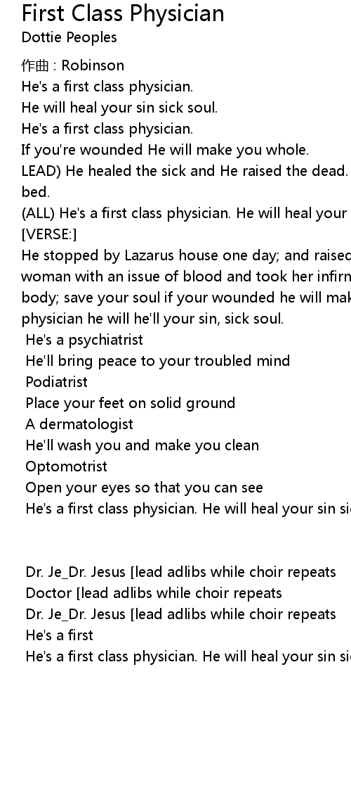 | (ALL) He's a first class physician. He will heal your sin sick soul. | |