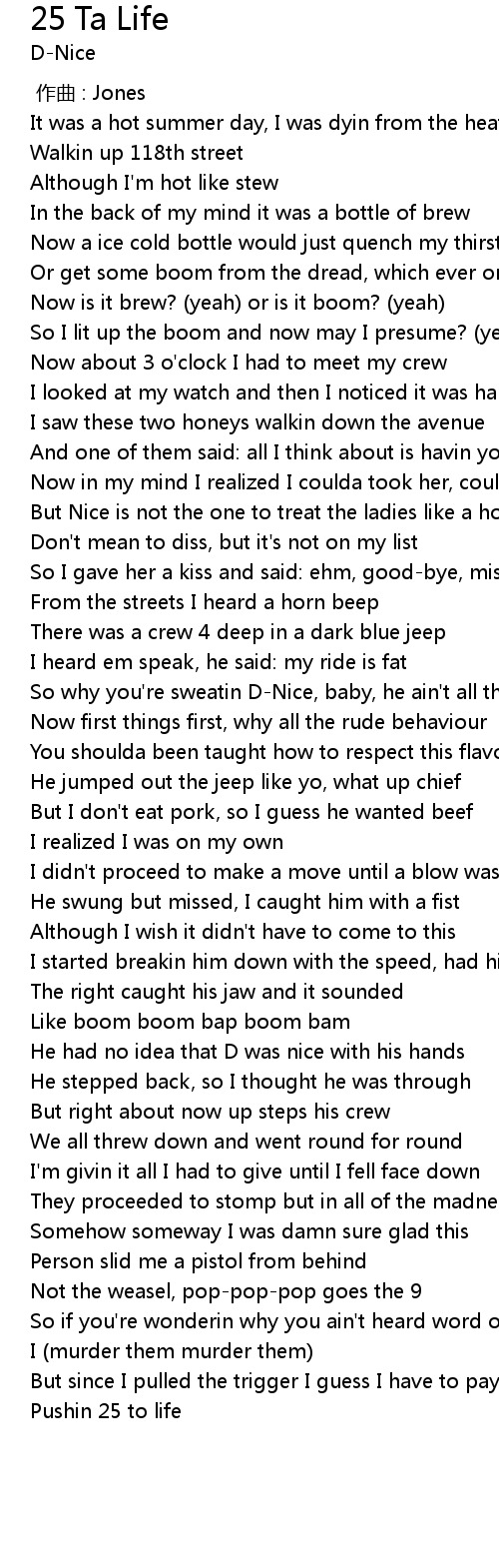 | [02:06.27] | Pushin 25 to life |